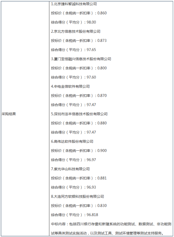 金都股改测试技术服务方面,中选供应商有3家,分别是:紫光华山科技有限公司,价格312.0465万元;中电金信软件有限公司,价格331.075万元;京北方信息技术股份有限公司,价格336.9146万元。据悉,分配规则为,入围的多家供应商按照具体测试需求进行响应,由金融科技部根据《四川银行股份有限公司信息科技外包人员评分评级实施细则》标准择优选择供应商人员进行测试工作实施,评分评级相同的情况,优先选择公开招标中得分最高的供应商。