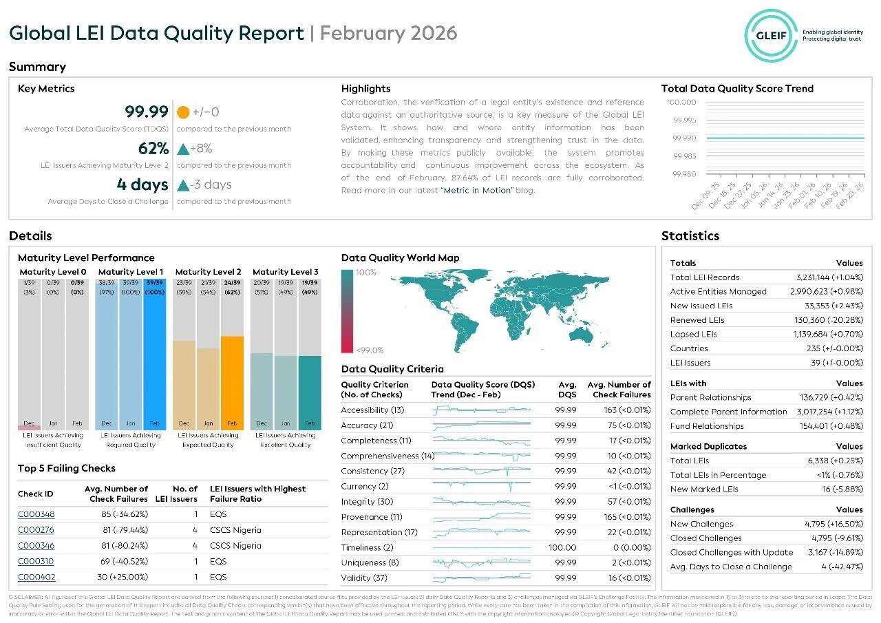 GLEIF发布2026年2月全球LEI数据质量报告