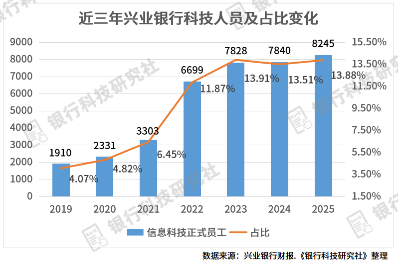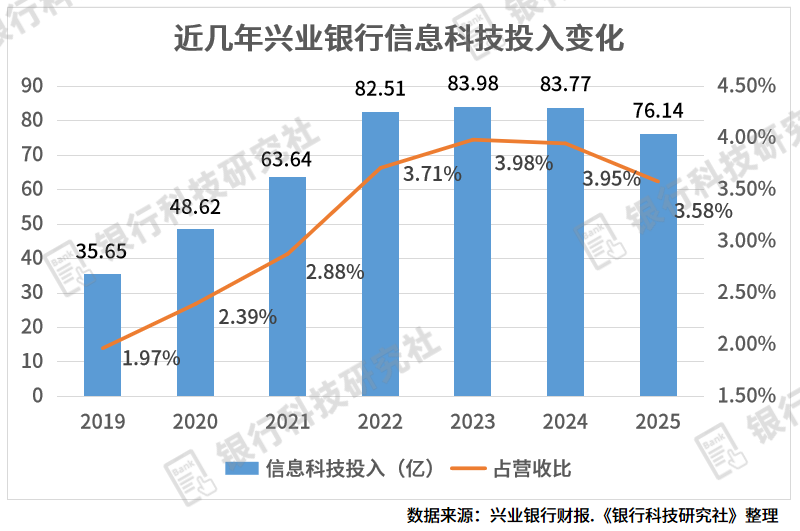 据《银行科技研究社》了解,2025年,兴业银行信息科技投入76.14亿元,同比下降9.11%,占营收3.58%。而这已经是该行科技投入、占比在2023年达到顶峰之后,连续两年下滑。