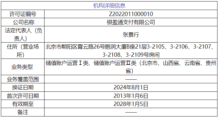 据移动支付网了解,银盈通于2005年4月在北京注册成立,2013年1月获得《支付业务许可证》,获准开展互联网支付业务,并在北京市、山西省、云南省、贵州省等地开展预付卡发行与受理业务。2023年1月,银盈通《支付业务许可证》顺利续展,牌照有效期延至2028年1月。随着支付业务类型重新划分,银盈通业务类型调整为“储值账户运营Ⅰ类、储值账户运营Ⅱ类(北京市、山西省、云南省、贵州省)”。