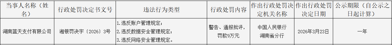 近日,中国人民银行湖南省分行发布新罚单,湖南蓝天支付有限公司(下称“蓝天支付”)因“违反账户管理规定;违反数据安全管理规定;违反网络安全管理规定”三条违法行为被警告、通报批评,罚款9万元。