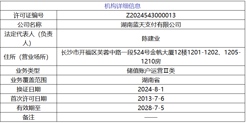 据移动支付网了解,蓝天支付于2012年8月1日在长沙成立,注册资金3000万元,是由上市公司华天酒店集团等企业发起组建的一家企业,华天酒店集团在其中的持股比例为25%。蓝天支付于2013年获得支付牌照,获准在湖南省开展预付卡发行与受理(现“储值账户运营Ⅱ类”)业务。蓝天卡是由蓝天支付发行和受理的通用消费卡,主要用于员工福利、礼品馈赠、商务接待、个人折扣等场景。
