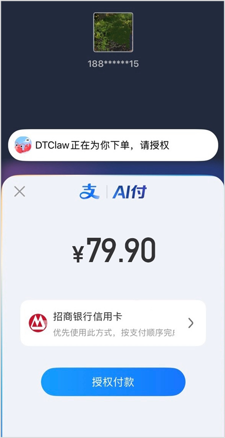 图说:用户用支付宝AI付在DTClaw购买会员