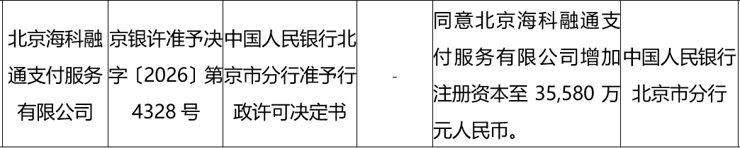 中国人民银行北京市分行非银行支付机构重大事项变更许可信息公示显示,同意北京海科融通支付服务有限公司(下称“海科融通”)增加注册资本至3.558亿元。