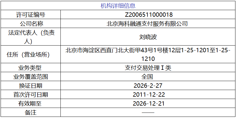 据移动支付网了解,海科融通成立于2001年,于2011年获得《支付业务许可证》,中国人民银行准许其在全国范围内开展银行卡收单业务。2024年《非银行支付机构监督管理条例》实施后,业务类型更新为“支付交易处理Ⅰ类”。